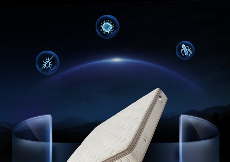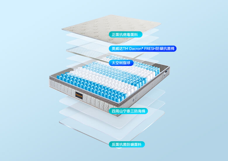 | 主 材 | 五区独立筒/嵌入式太空树脂球/英威达抗菌棉 /3D材质/SANITIZED®三防海绵 |